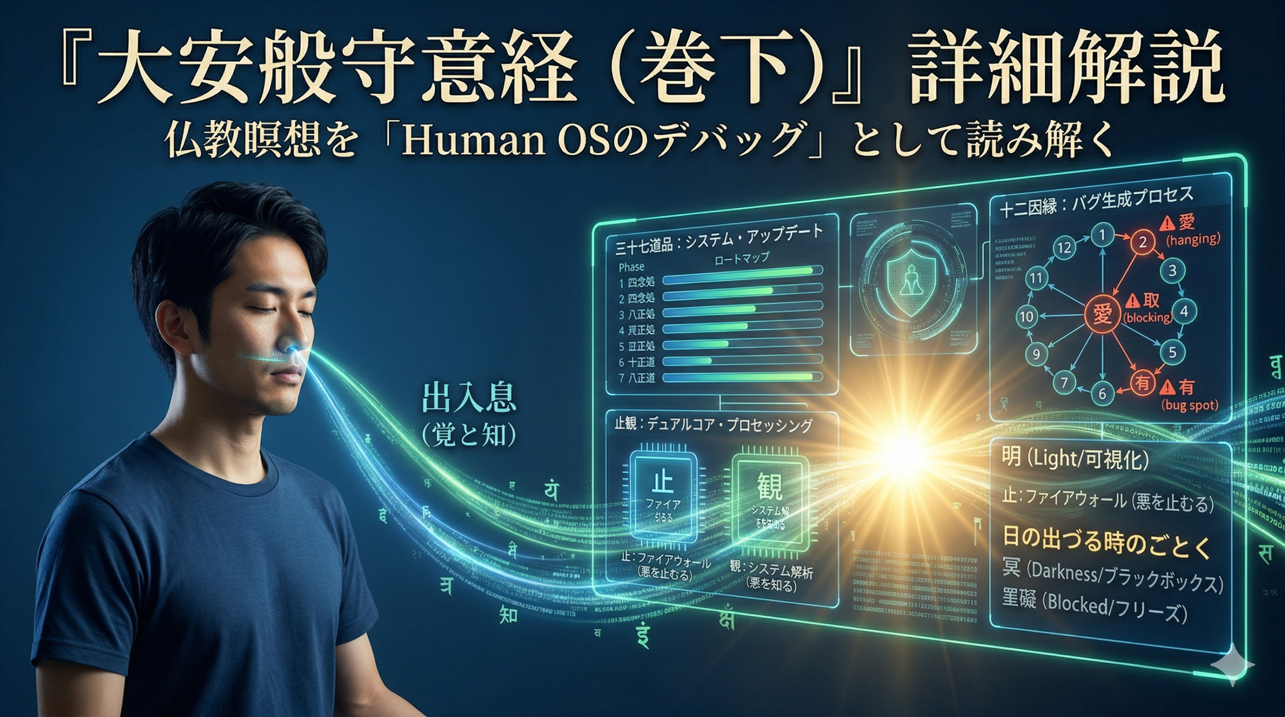 • Human OS的解釈: ここが初心者が最も陥る罠の完全な解説です! 「集中できないから、もっと強く数を数えよう(絆そう)」とするのは、**「ウイルスに感染してフリーズしているPC上で、さらに重たいソフトを無理やり起動しようとする行為」**です。エラーを吐くのは当然です。 安世高は「悪意(マルウェア)には絆すべからず(アンカーは打てない)」と明言しています。まず、その不正プロセス(悪意)を検知して落とす(止まる)ことが先決であり、正常なカウント処理はその後でしか実行できません。