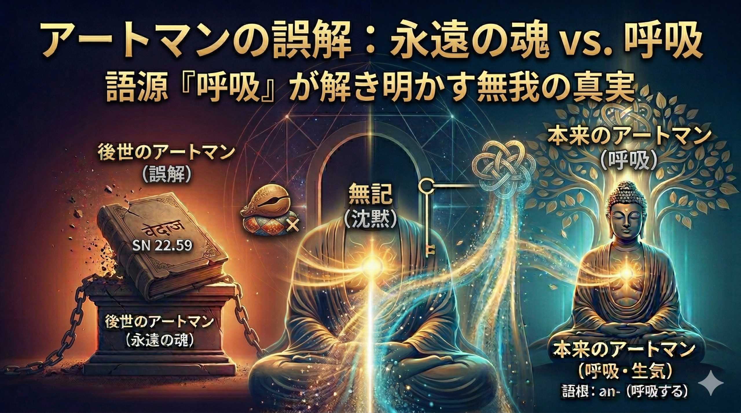 これは言葉遊びではない。釈迦が「アートマン」という言葉を直接使わなかった理由は明確だ。当時の人々にとって「アートマン」はすでに「永遠の魂」を意味していた。その言葉を使えば、後世版のアートマンへの執着を生む。だから「アーナーパーナ(出入息)」という純粋な物理現象の言葉を選んだ。