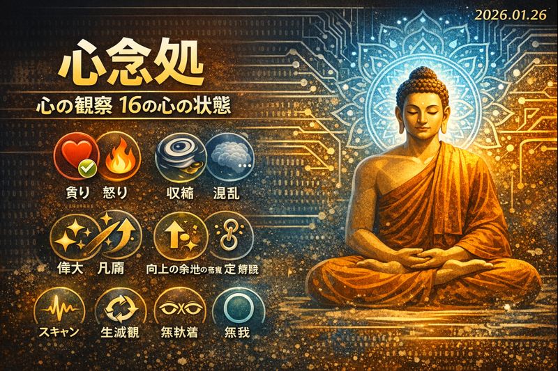 ここでは、「何を考えているか」という思考の内容は重要ではありません。「今、心全体がどのような『モード』にあるか」を、一歩引いた視点から客観的に観察します。ブッダは、私たちが陥りやすい心の「色合い」や「質」を、貪り(欲求)、怒り、迷いといった基本的な煩悩の状態から、深く集中した崇高な状態まで、16のパターン(8つの対)に分類して示されました。