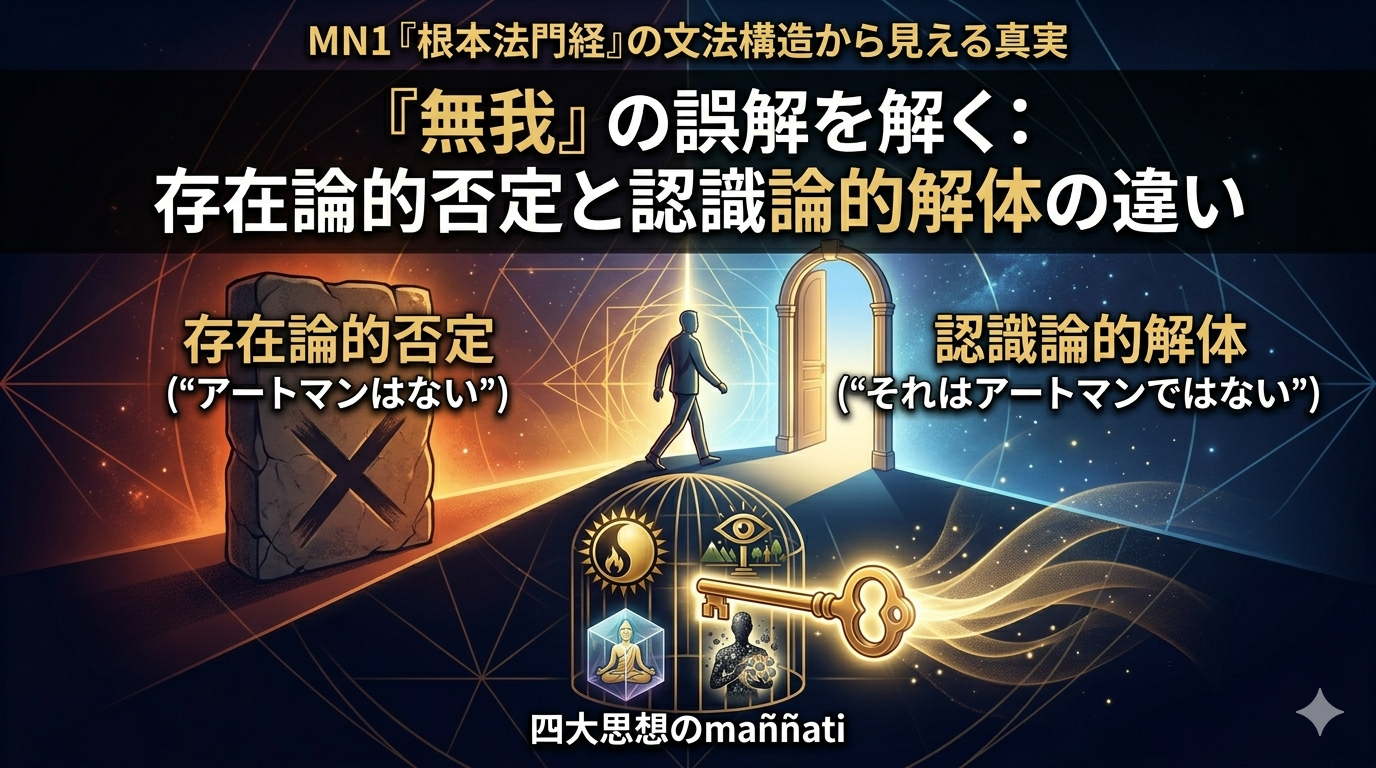 従来の仲教理解では、非我(anattā)は「アートマンは存在しない」という存在論的否定として理解されてきた。しかしMN1の構造分析から見えるのは、全く異なる構造である。釈迦が言ったのは「それはアートマンではない」であり、「アートマンは存在しない」とは言っていない。