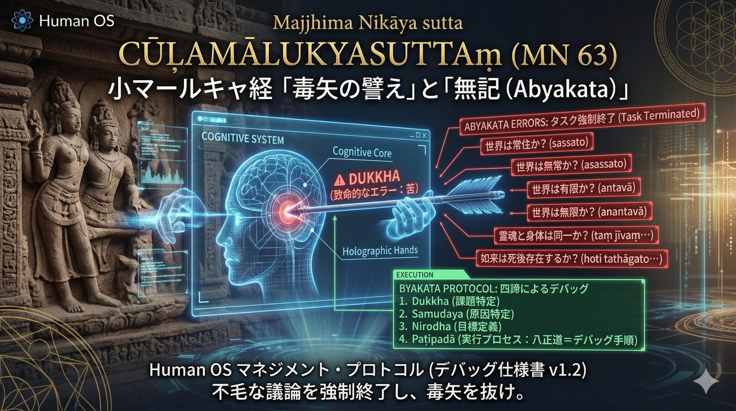 【訳】(同様に、世界が有限か無限か、生命と身体が同一か別か、如来が死後存在するかしないかなど、すべての形而上学的問いについて同じことが言える。どの見解を持っていても、生老病死の苦は存在し、仏陀はその滅尽を説くのである)