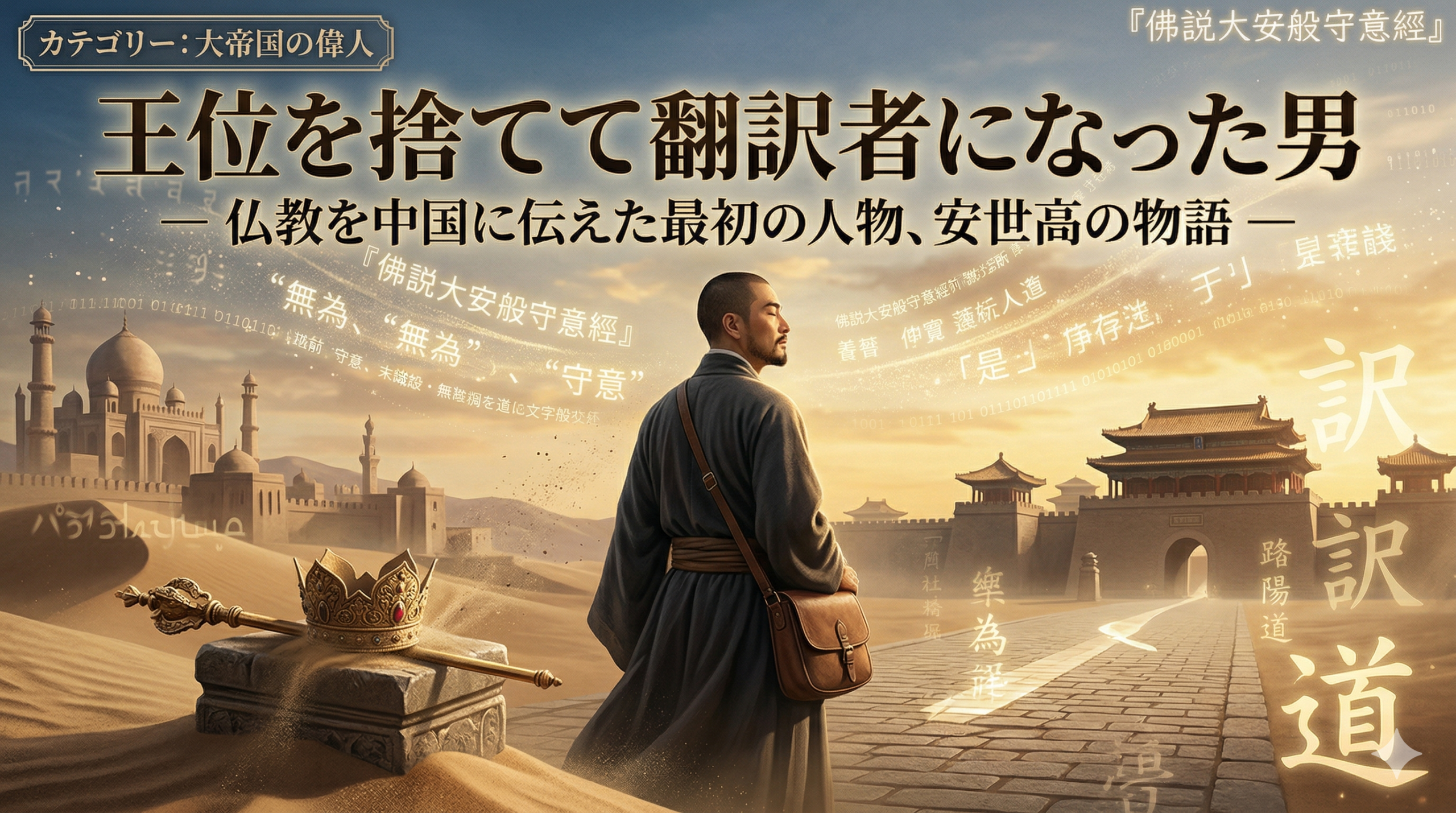 紀元147年頃のことである。安息国(パルティア帝国、現在のイラン周辺)の王太子が、王位を叔父に譲り渡し、故郷を捨てた。大帝国の次期国王として約束されていた全ての権力と富を棄て、一介の僧侶としてシルクロードを東へ歩き始めた。