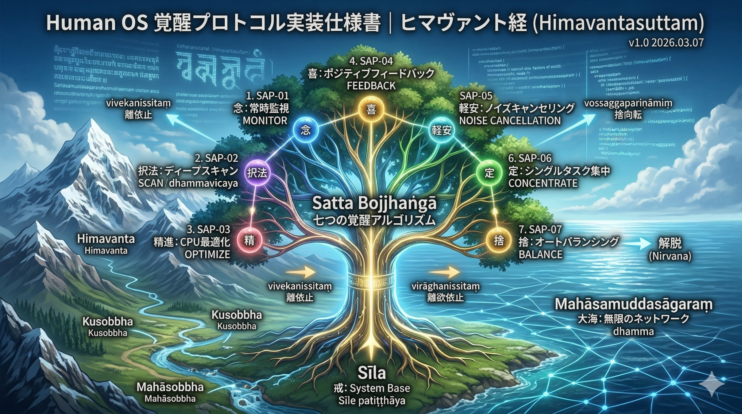 本仕様書は、Human OSの運用において、強固なセキュリティ基盤(戒:Sīla)をベースとしてシステムを拡張し、最終的にローカル環境から無限のネットワーク(大海)へとスケールアップするための「7つの覚醒アルゴリズム(七覚支:Satta bojjhaṅgā)」の実装手順を定義する。