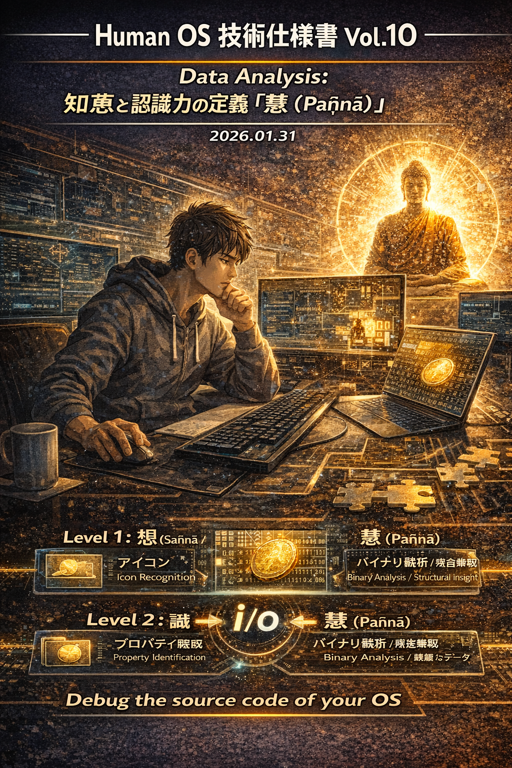 - IT Metaphor: ファイルをバイナリ・エディタで開き、**「0と1の羅列(無常なデータの集まり)」**であることを直視する。