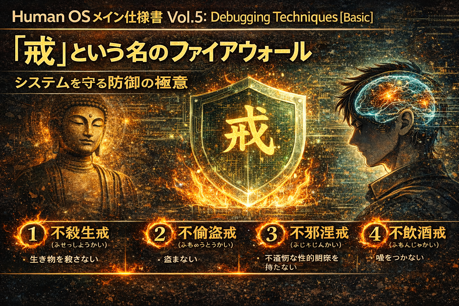 では、Human OSの標準的なセキュリティ設定として推奨されている**「五戒(ごかい)」**を、システム用語で翻訳してみましょう。これらは、あなたのシステムを無用なトラブルから守るための鉄壁のファイアウォール設定です。