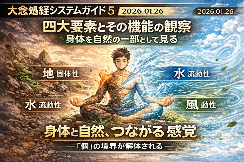 四大要素の観察は、身体を「私」や「人間」として把握する見方をいったん降ろし、地・水・火・風という“性質(プロパティ)”として点検する訓練です。
