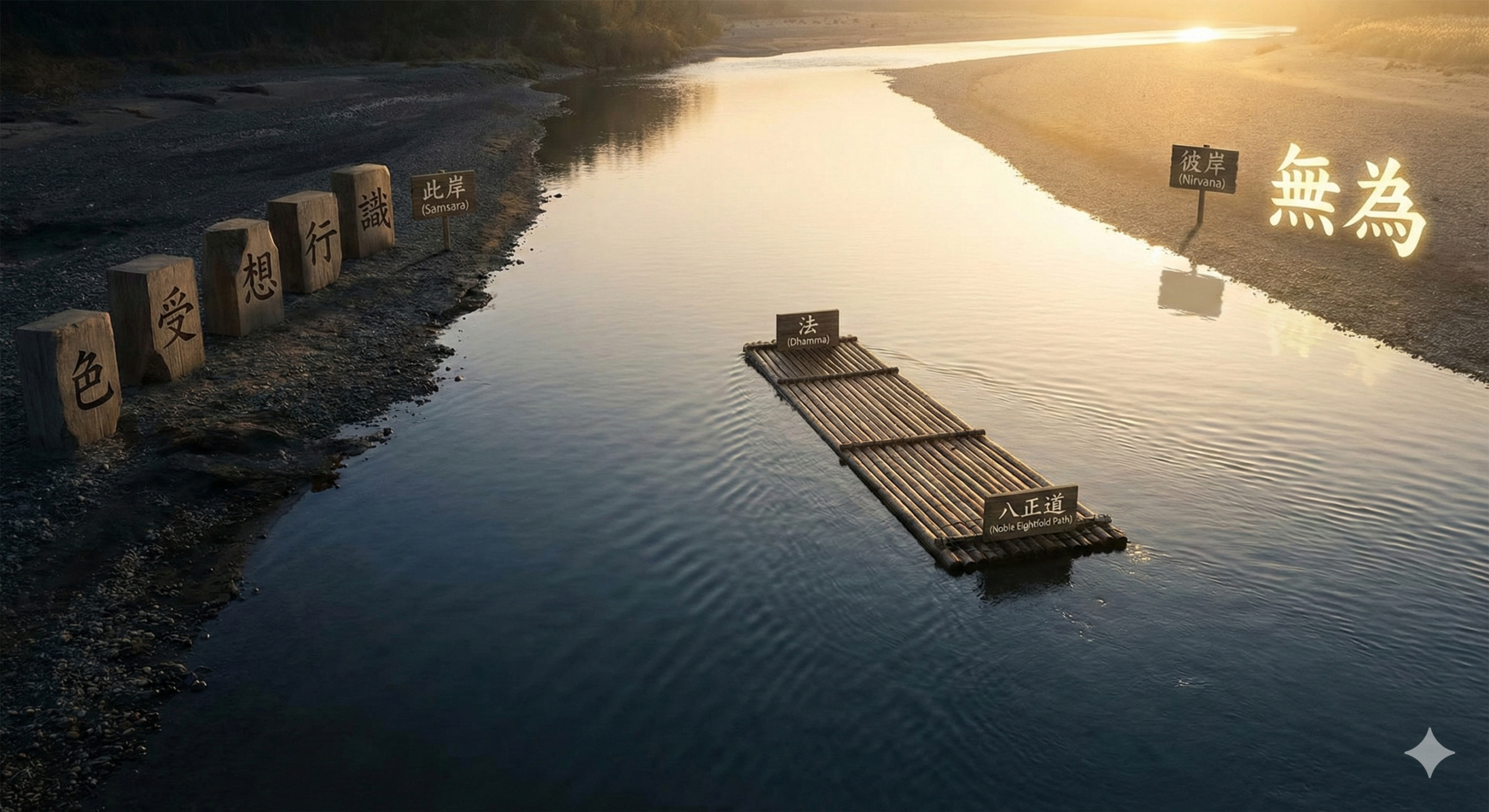 そしてお釈迦さまが説いた「筏の比喩」がここに重なる。渡し舟(法)でさえ、彼岸に着いたら手放すものだ。法もまた有為法の道具だから。