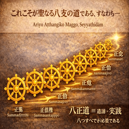 ここまでで、転法輪経の核心——二極端の否定、中道の提示、四聖諦の展開、八正道の確認——がすべて完了しました。