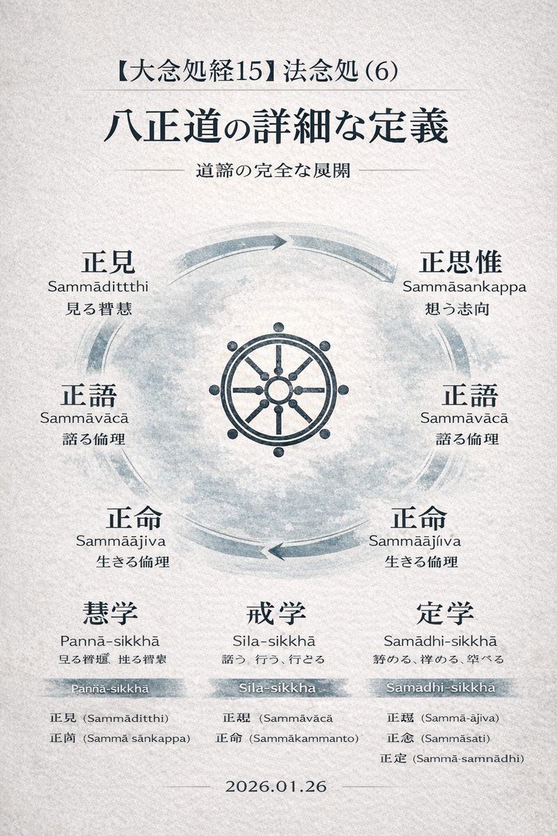 大念処経では、道諦(四聖諦の第四)である八正道について、それぞれの詳細な定義が示されています。これは実践の具体的な指針となります。