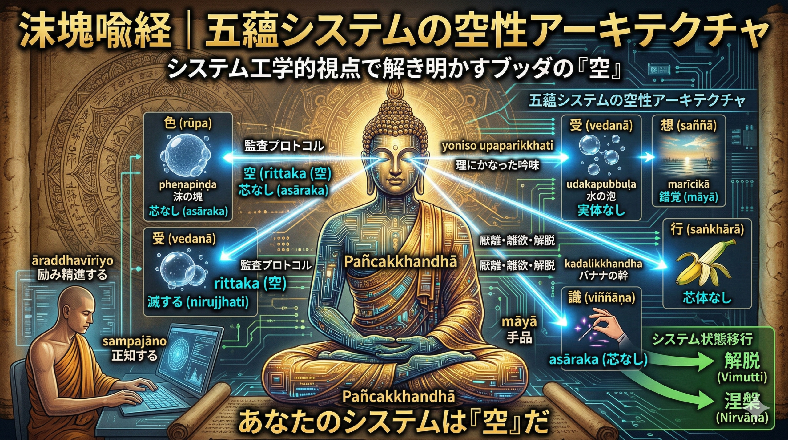 本仕様書は、人間システムを構成する「五蘊(pañcakkhandhā)」が、いかなる本質(sāra)も持たない空(rittaka)な構造であることを、ブッダが提示した五つの比喩(沫塊、水の泡、陽炎、バナナの幹、手品)を用いて、システム工学的視点で定義する。比丘(システム監査者)は、この仕様に基づき五蘊を理にかなった仕方で吟味し、解脱(Vimutti)へと向かうデバッグ・プロトコルを実行しなければならない。