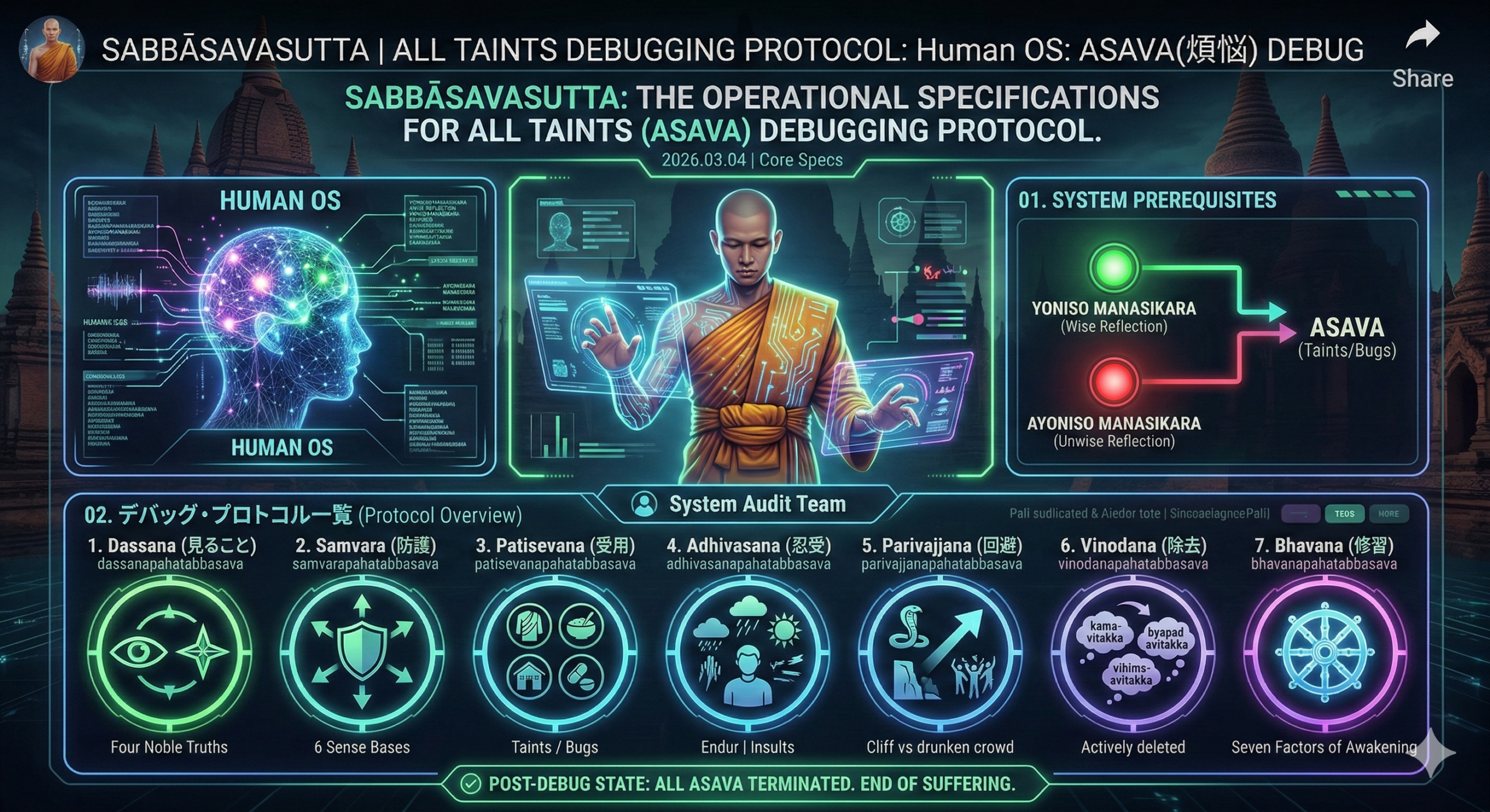 本仕様書は、初期仏教経典『Sabbāsavasutta(一切漏経)』に基づき、煩悩(asava)を断じるための七つのデバッグ・プロトコルを定義する。世尊(チーフ・アーキテクト)がサーヴァッティーのジェータ林にて比丘(システム監査チーム)に説いた、Human OSの全煩悩を防護する包括的な運用手順書である。