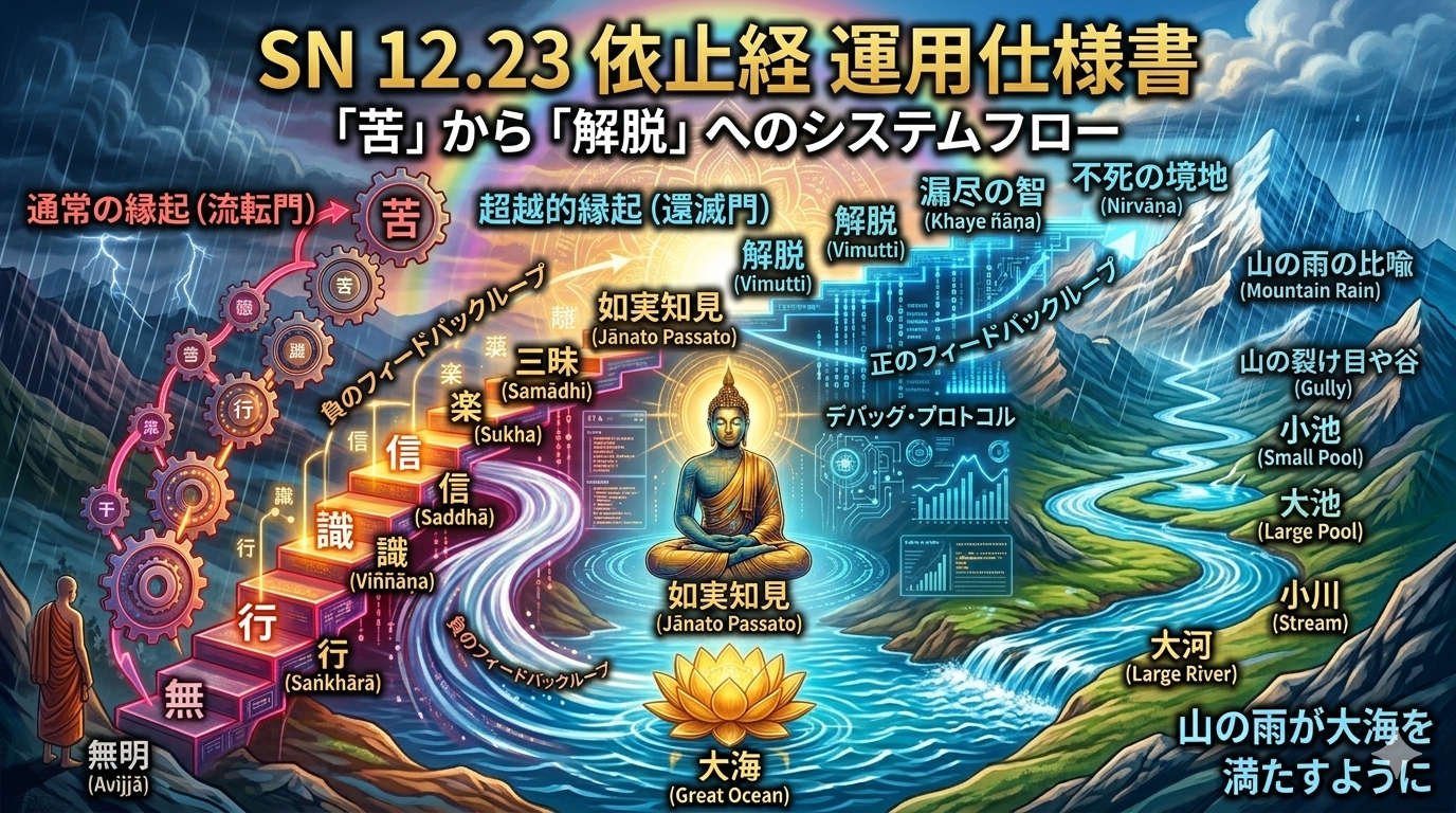 本仕様書は、仏教経典『相応部』12.23「依止経(ウパニサ・スッタ)」に基づき、苦(Dukkha)から解脱(Vimutti)および漏尽の智(Khaye ñāṇa)に至る超越的縁起のシステムフローを定義する。