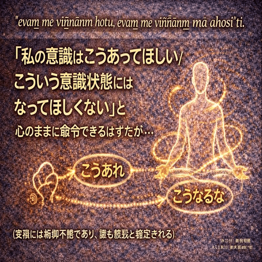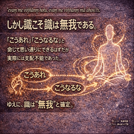 この位置づけは非常に重要で、五蘊のうち 最後の「識」は、修行者が「これこそ私だ」と掴みやすい領域です。そこで経は、最も精妙な把持対象に対しても同じテストをかけ、“意のままにならない=自己ではない” を徹底します。