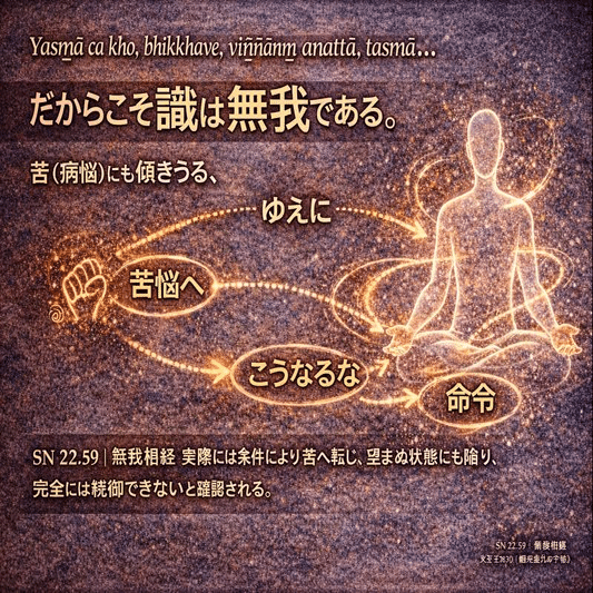 「比丘たちよ、もし“意識(識)”が本当に自己なら、意識が苦・逼迫へと転じるはずがなく、さらに意識に対して『こうなれ/こうなるな』と命じて思い通りにできるはずだ——(しかし現実はそうではない)。」