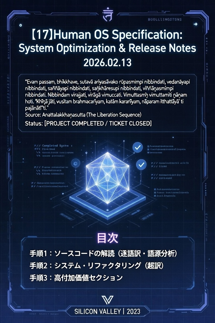 仏教のゴールは「無限の向上」ではない。**「完了(Done)」**である。 現代の自己啓発は「もっと成長しろ」と煽るが、それは「開発(苦)」が終わらないことを意味する。 ブッダの宣言は違う。「開発は終わった。これ以上、何も足さないし、何も引かない」。 これこそが究極の安らぎだ。 「まだ何か足りない気がする」という欠乏感(焦り)がゼロになった状態。 これ以上のアップデートが必要ない、完全なる静寂(Silence)。それがHuman OSの到達点だ。