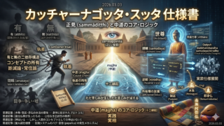 釈迦が説いた『第三の定経(AN 4.94)』のパーリ語対訳。心の静けさ「止(サマタ)」と解析力「観(ヴィパッサナー)」。自分に足りないモジュールを持つ者に教えを請うという、極めて論理的な「人間OS」の相互補完システムと、4つのタイプ別学習プロトコルを解説します。