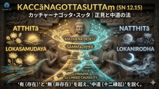 相応部経典SN 12.15『カッチャーナゴッタ・スッタ』をソースに、仏教システムの基本仕様「正見」と、それを実装する「中道」のコア・ロジック(十二縁起)を施設。世界を「有」「無」の二極ではなく、苦の生起と滅尽の連鎖として記述する仕様書。