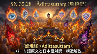 初期仏教の重要経典『燃焼経(Ādittasuttaṃ)』のパーリ語原文と日本語対訳をまとめました。感覚器官(六根)から生じる認識が、いかにして貪・瞋・癡の火で燃え上がるのか。そのシステム構造と、執着を離れて解脱に至るプロセスを図解とともに詳しく解説します。