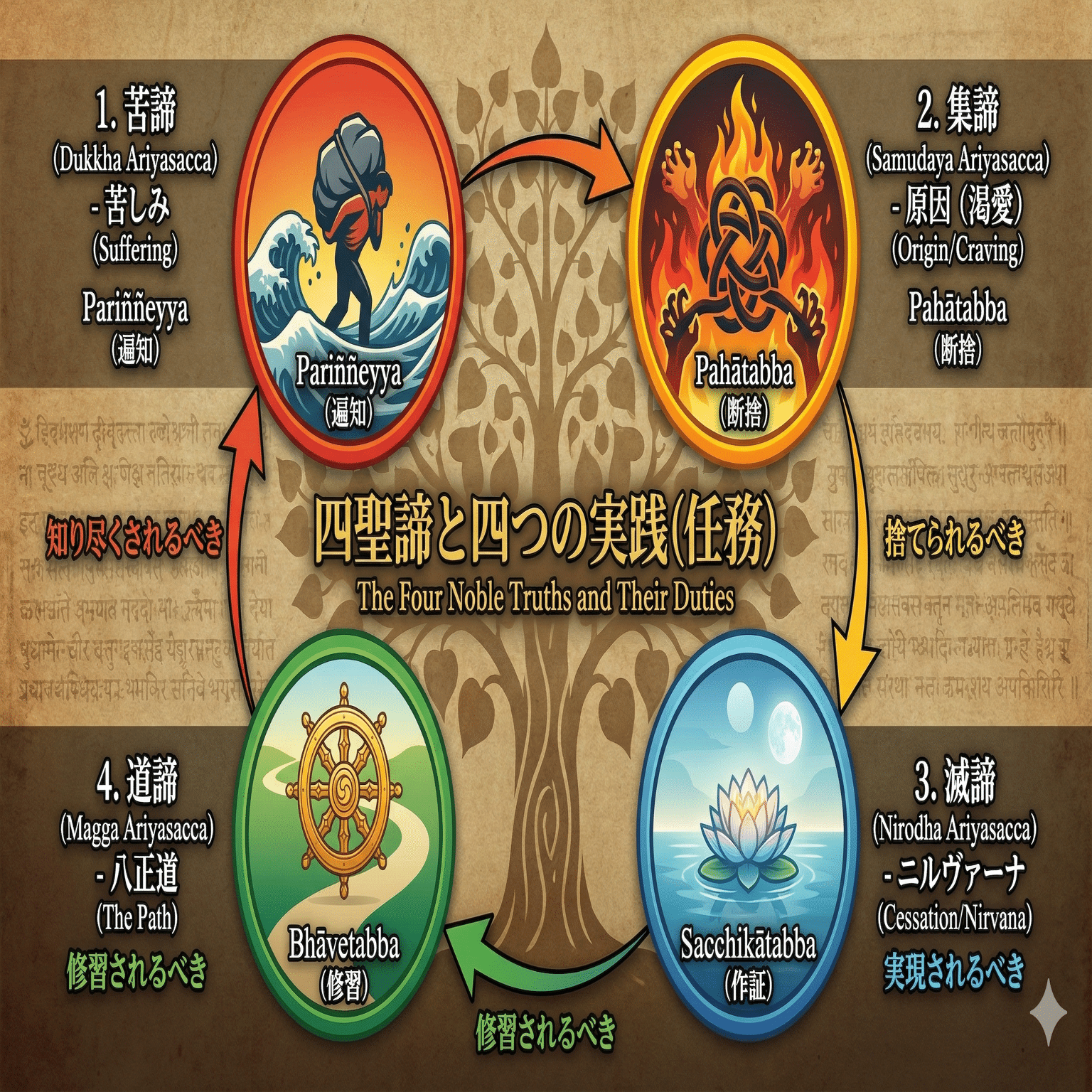 - 論証の構造(四聖諦の四つの機能): ブッダはここで、4つの真理にはそれぞれ異なる「取り扱い方」があることを示しています。
